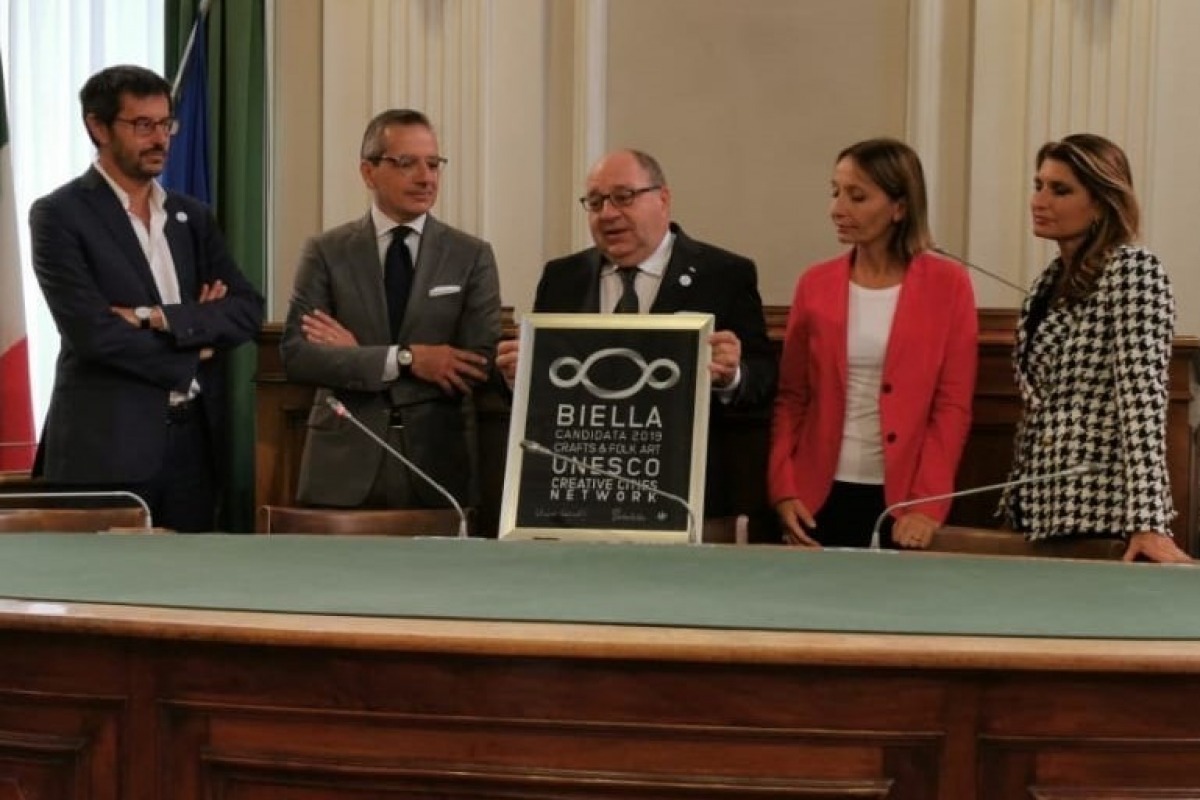 A special ceremony was held this morning in the council chamber of Palazzo Oropa: the CEO of Lanificio Cerruti, Paolo Torello Viera, gave the mayor of Biella Claudio Corradino and the city a celebratory picture dedicated to the candidacy for the Network of Cities Unesco creative signed by Nino Cerruti and Michelangelo Pistoletto.
